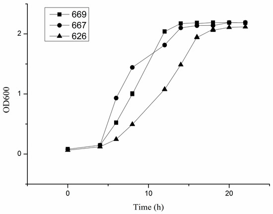 Growth curves of three strains of Bifidobacterium adolescentis. The horizontal axis is the time of culturing B. adolescentis, and the vertical axis is the absorbance value of the culture solution at 600 nm: 669, the growth curve of B. adolescentis 669; 667, the growth curve of B. adolescentis 667; and 626, the growth curve of B. adolescentis 626. The curves shown are from a single experiment (mean ± SD, n = 3).