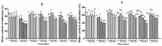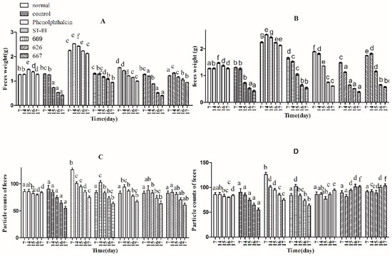 Defecation status of mice during experiments in eight BALB/c mice in each group. Phenolphthalein: 10 mg/kg body weight; 626: B. adolescentis CCFM 626; 667: B. adolescentis CCFM 667; 669: B. adolescentis CCFM 669; ST-III: Lactobacillus plantarum ST-III; High dose: 1 × 1010 colony-forming units (CFU); Low dose: 1 × 108 CFU. (A,C,E) High-dose groups; and (B,D,F) low-dose groups. Mean values with different letters (a–g) over bars are significantly different (p < 0.05) according to one-way analysis of variance and Duncan’s multiple range test.