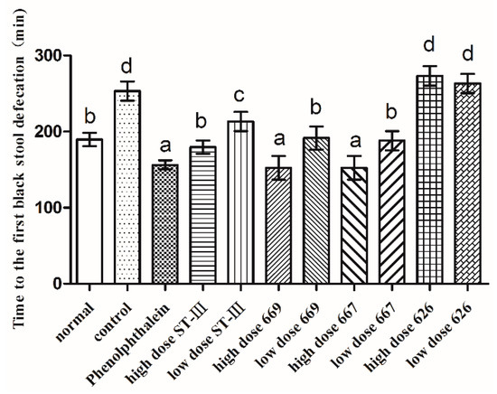 The time to the first black stool defecation was measured to evaluate the effect of B. adolescentis on constipation. The results are shown in Figure 3. The defecation time was significantly different in each group. The time to the first black stool defecation in the normal group was similar to that in the low-dose B. adolescentis CCFM 669 and 667 groups and the high-dose ST-III group. Meanwhile, the defecation times in the phenolphthalein group and the high-dose B. adolescentis CCFM 669 and 667 groups were the shortest, and those in the control and B. adolescentis CCFM 626 groups were the longest, which indicates that B. adolescentis CCFM 626 has no effect on constipation.