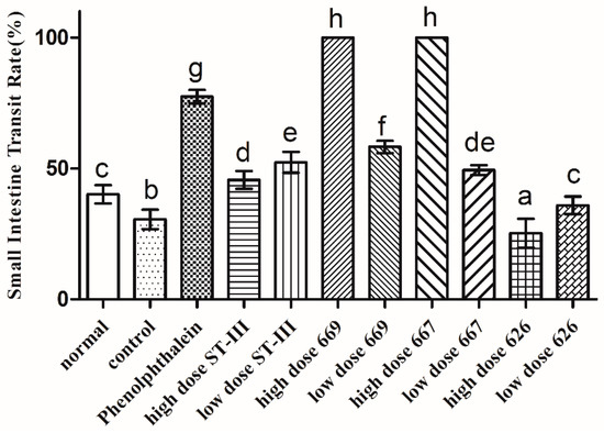 Small intestinal transit rate of mice after constipation was induced by loperamide in eight BALB/c mice in each group. Phenolphthalein: 10 mg/kg body weight; 626: B. adolescentis CCFM 626; 667: B. adolescentis CCFM 667; 669: B. adolescentis CCFM 669; ST-III: L. plantarum ST-III; high dose: 1 × 1010 CFU; low dose: 1 × 108 CFU. Mean values with different letters (a–h) over the bars are significantly different (p < 0.05) according to Duncan’s multiple range test.