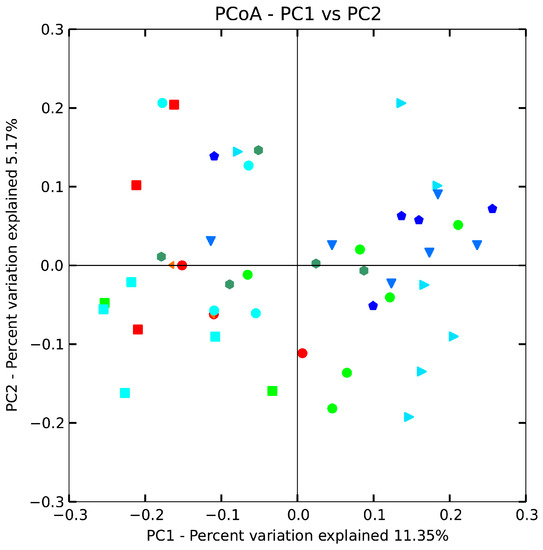 Principal coordinates analysis (PCoA) plots based on unweighted UniFrac metric. Each colored symbol represents the composition of fecal microbiota of one mouse. Symbol: