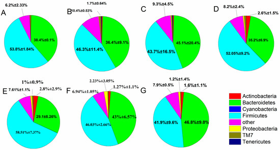 Relative abundance of main phyla in the different groups after constipation: (A) normal; (B) control; (C) phenolphthalein; (D) ST-III; (E) B. adolescentis CCFM 669; (F) B. adolescentis CCFM 667; and (G) B. adolescentis CCFM 626.