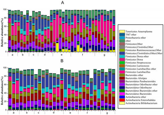 Relative abundance of main genera >0.1% at d1422-0067/18/02/0317/s2ifferent periods in different groups: (A) before constipation (Days 1 to 14); and (B) during constipation (Days 15 to 17) ((a) normal group; (b) control group; (c) phenolphthalein group; (d) ST-III group; (e) B. adolescentis CCFM 669 group; (f) B. adolescentis CCFM 626 group; and (g) B. adolescentis CCFM 667 group).