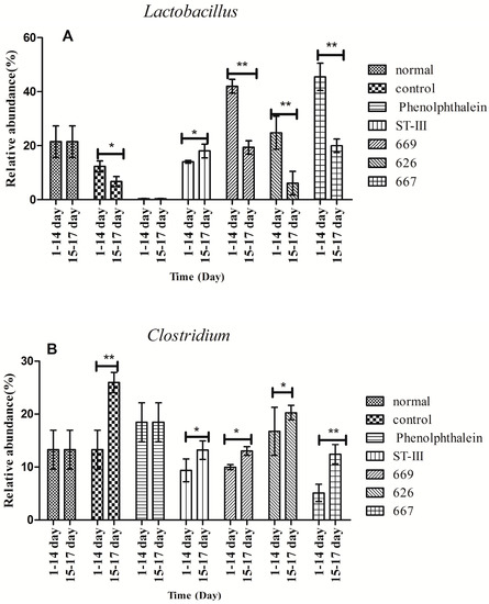 After loperamide-induced constipation (Days 15 to 17), the fecal flora structure changed slightly compared with that from the first 14 days (Figure 7B). The levels of Lactobacillus (Figure 7) and Bifidobacterium decreased in the B. adolescentis treatment groups but were still higher than that in the control group. In addition, Alistipes and Dorea tended to revert to their original levels before B. adolescentis treatment, as indicated by the cluster results between the data points of Figure 6A,E–G, and Figure 6B,E–G. The relative abundance of Clostridium showed a significantly decrease compared to the normal and phenolphthalein groups as suggested by the results of the one-way analysis of variance and Duncan’s multiple range test (Figure 8).