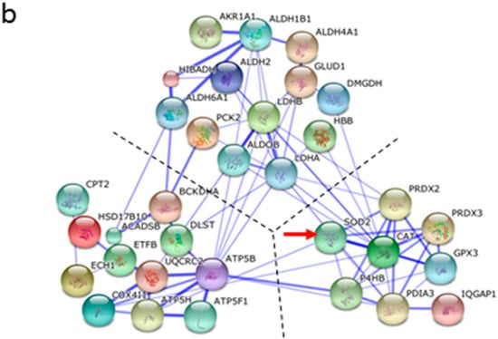 Three pairs of tumor and adjacent tissues from ccRCC patients were analyzed by LC-MS/MS. Totally, 5571 and 5816 non-redundant proteins with FDR < 0.01 were identified in adjacent and ccRCC tissues, respectively (Table S1). Among the identified proteins, the average spectral counts of three repeats were used to evaluate their expression levels, which revealed 100 up- and 108 down-regulated proteins for at least 1.4 folds in ccRCC vs. adjacent tissues with the criteria of p < 0.05, detected in every replicate, and the average spectral counts of >20 (Table S2). According to Database for Annotation, Visualization, and Integrated Discovery (DAVID) functional annotation, 33 of the 208 dysregulated proteins were related to oxido-reductases (p = 2.87 × 10−18) (Tables S3 and S4). Heatmap analysis (Figure 1a) denoted the involvement of these oxidoreductases in binding with cofactors, coenzyme, NAD, NADH and/or NAD(P). Notably, MNSOD was among these oxidoreductases, suggesting that mitochondrial MNSOD was also involved in the electron transport chain for ROS removal. Consistent with these observations, ontological category based on biological process using Search Tool for the Retrieval of Interacting Genes/Proteins (STRING) (Table S5) indicated that one of the most significant categories was oxidation-reduction process (37 proteins, p = 6.49 × 10−17) (Table S6). Three main interactive clusters were formed among the 37 interacting proteins with MNSOD as an important node (Figure 1b). Because cancer cells usually demand high ROS concentrations to maintain their high proliferation rate [14], these data suggested that oxido-reductases, particularly MNSOD, played an important role in RCC pathogenesis [16].