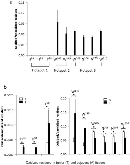 Quantification of the oxidized residues of MNSOD. (a) The average ratios of the oxidized to unoxidized residues in tumor + adjacent tissues. Abundances of the modified and unmodified peptide fragments containing the nine oxidized and unoxidized residues (H54, H55, Y58, W147, W149, W205, N206, N209 and W210) were used to calculate the ratios (Table S7). Three hotspots are indicated; (b) comparison of the oxidation modification between tumor and adjacent tissues. The relative ratios of oxidized to unoxidized residues at histidine 54 (H54), 55 (H55) and tyrosine 58 (Y58) were low both in ccRCC tumor tissues and adjacent tissues but, dramatically increased in tumor comparing with adjacent tissues (the left panel, * p < 0.03, n = 4) (Table S7). The relative ratios at tryptophan 147 (W147) and 149 (W149) were also increased significantly in tumor, but the relative ratios at tryptophan 205 (W205), asparagine 206 (N206), asparagine 209 (N209) and tryptophan 210 (W210) were decreased slightly in tumor (the right panel, * p < 0.03, n = 4) (Table S7).