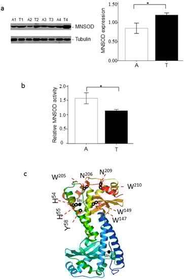 MNSOD expression, enzymatic activity and the potential oxidation hotspots of MNSOD. (a) The expression of MNSOD in adjacent (A) and ccRCC (T) tissues. Four individual ccRCC and adjacent tissue lysates were separated by SDS-PAGE and the expression of MNSOD was detected by Western blotting. Tubulin served as the loading control (* p < 0.05, n = 4); (b) MNSOD enzymatic activity in adjacent (A) and ccRCC (T) tissues. Superoxide dismutase (SOD) activity kit was used to measure MNSOD enzymatic activity. The relative MNSOD enzymatic activity was normalized by MNSOD expression (* p < 0.05, n = 4); (c) the potential oxidation hotspots in three dimensional structure of MNSOD. The ribbon structure of MNSOD subunit (1LUV.pdb) is depicted with the two separate polypeptide chains. The active sites (manganese ions, Mn) are depicted as solid spheres and the oxidative modification sites (H54, H55, Y58, W147, W149, W205, N206, N209, W210) are indicated as red dashed arrows. The 3D structure shows the three oxidation hotspots (hotspot 1 (H54, H55, Y58), hotspot 2 (W147, W149) and hotspot 3 (W205, N206, N209, W210)) are distributed in the surface of homotetrameric MNSOD and point to protein internal, which composite a hydrophobic side chain and affect the molecular structure of MNSOD. The colors in the ribbon structure of MNSOD subunit are the automatically displayed colors according to 1LUV.pdb.