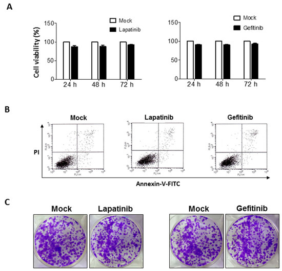 The EGFR inhibitors, lapatinib and gefitinib, were evaluated for anti-cancer effects on T24 human bladder cancer cells. When we treated T24 human bladder cancer cells with 5 μM of these EGFR inhibitors, the CCK-8 assay showed that neither lapatinib nor gefitinib could reduce cell viability in a time-dependent manner (Figure 1A). Apoptotic cell death did not significantly increase after treatment with either of the EGFR inhibitors (5 μM) for 24 h, compared to that in the negative control when assessed with flow cytometry (Figure 1B). Clonogenic assay also revealed that there was no significant reduction of the self-renewal capabilities of T24 cells when treated with EGFR inhibitors (5 μM) for 10 to 14 days, compared to that in the negative control (Figure 1C). In bladder cancer cell line J82, lapatinib and gefitinib did not affect the self-renewal potential when measured by the clonogenic assay (Figure S1A).