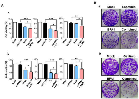 Synergistic anti-cancer effects of EGFR inhibitors and autophagy inhibitors on T24 human bladder cancer cells. (A) Evaluation of anti-cancer effects of (a) lapatinib and (b) gefitinib treatments in T24 human bladder cancer cells by cell viability tests under different treatment combinations (control, 5 μM of EGFR inhibitors (lapatinib; gefitinib), autophagy inhibitors and both agents) for 24 h. Autophagy inhibitors used in this study were 5 nM of bafilomycin A1 (BFA1), 10 μM of chloroquine (CQ) and 10 mM of 3-methyladenine (3-MA). Cell viability is shown as the mean percentage (%) of control ± SEM (n = 3, * p < 0.05, ** p < 0.01, *** p <0.001); (B) clonogenic assay determining the effects of concurrent treatments of (a) lapatinib (5 μM) and (b) gefitinib treatments (5 μM) with autophagy inhibitor BFA1 (5 nM) on clonal proliferation of T24 cells.