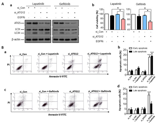 Effects of EGFR inhibitors with autophagy regulatory gene inhibition on T24 human bladder cancer cells. (A) (a) Western blot analysis to determine the knock-down efficiency and autophagy suppression by transfection of ATG12-siRNA (si_ATG12) in T24 cells, combined with the treatment of EGFR inhibitors (EGFRi). Scramble siRNA (si_Con; 50 nM) was used as a negative control of (si_ATG12). (b) Cell viability assay of T24 cells under the same treatment condition of EGFRi (5 μM) and si_ATG12 (50 nM) for 48 h; data are represented by the mean percentage of the control ± SEM (n = 3, * p < 0.05); (B) apoptosis assay by flow cytometry to examine the synergistic effects of EGFRi (5 μM) and genetic inhibition of autophagy activity by transfection of si_ATG12 (50 nM) for 48 h in T24 cells. (a,b) Lapatinib and (c,d) gefitinib were used as EGFRi. (a,c) representative results of the apoptosis assay and (b,d) quantitative data as bar graphs, indicating the proportion of early and late apoptotic cell death. Values are shown as the mean ± SEM (n = 3, * p < 0.05, *** p <0.001). si_Con (50 nM) was used as a negative control of si_ATG12.