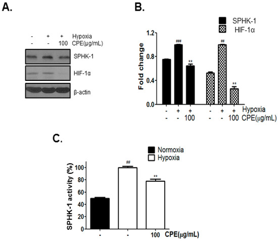 According to our precedent data, Crataegus Pinnatifida Bunge var. typical Schneider ethanol extract (CPE) more than 10% decreased DU145 cell growth under hypoxic condition compared to under normoxic condition (data not shown). To investigate whether CPE affects the expression of HIF-1α and SPHK-1, DU145 cells were incubated with 100 µg/mL CPE for 4 h in hypoxic condition. As shown in Figure 1A–C, CPE decreased hypoxia-induced expression of SPHK-1 and HIF-1α as well as SPHK-1 activity. Thus, the abundance of HIF-1α and SPHK-1 increased in hypoxic condition compared to in normoxic condition.