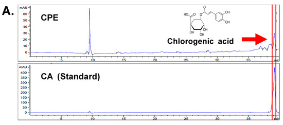 To analyze the components of CPE, CA were run on Hichrom HPLC columns (5 μm, 250 × 4.6 mm, Hichrom, Ltd., Theale, UK) using a high HPLC system (Agilent Technologies, Santa Clara, CA, USA). The mobile phase consisted of 95% water containing 0.1% trifluoroacetic acid (solvent A) and 5% methanol containing 40% acetonitrile (solvent B). The solvent flow rate was 0.3 mL/min with gradient elution: 0–31.2 min, 28.4%; 31.2–31.4 min, 30.4%; 31.4–38 min, 34.7%; 38–50 min, 45% of solvent B. The ambient temperature was set at 45 °C. UV detection wavelength was set at 230 nm.