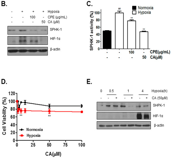 Cytotoxicity of CPE and CA were evaluated by 3-(4,5-dimethylthiazol-2-yl)-2,5-diphenyl tetrazolium bromide (MTT) (Sigma-Aldrich, St. Louis, MO, USA) assay. Cells were seeded at a density of 1 × 104 cells per well in a 96 well plate, cultured for 24 h, and then treated with various concentrations of CPE and CA under hypoxia and normoxia. After 24 h incubation, the 50 µL of MTT solution (1 mg/mL) was added to each well and incubated at 37 °C in dark for 2 h. The viable cell number was correlated with the production of formazan that was dissolved in dimethyl sulfoxide (DMSO) and optical density (OD) was measured at 570 nm using a microplate reader (Molecular Devices Co., Sunnyvale, CA, USA). Cell viability was calculated by the following equation: Cell viability (%) = [OD (sample) − OD (blank)]/[OD (control) − OD (blank)] × 100.