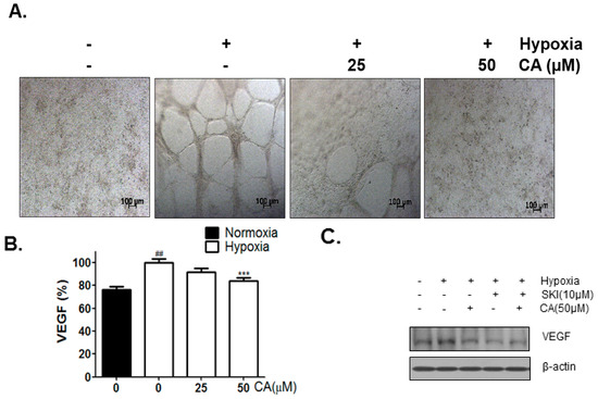 To analyze the anti-angiogenic effect of CA, Human umbilical vein endothelial cells (HUVECs) tube formation assay was performed. The supernatants of the culture media from the hypoxia-induced DU145 cells treated with different concentrations of CA (0, 25, and 50 µM) for 24 h were used for HUVECs tube formation. As shown in Figure 4A, hypoxia-induced supernatant from cells without treatment with CA formed the HUVEC tube well, whereas hypoxia-induced supernatant form cells treated with CA suppressed the HUVECs tube formation. Vascular endothelial growth factor (VEGF) content of the supernatant was analyzed by VEGF enzyme-linked immunosorbent assay (ELISA). Consistent with the results of HUVECs tube formation assay, CA suppressed the secretion of VEGF. The rate of inhibition of VEGF activity by CA at 25 μM and 50 μM was 10% and 18%, respectively (Figure 4B). VEGF cellular level was checked by western blotting. Both SKI and CA were found to inhibit VEGF expression (Figure 4C).