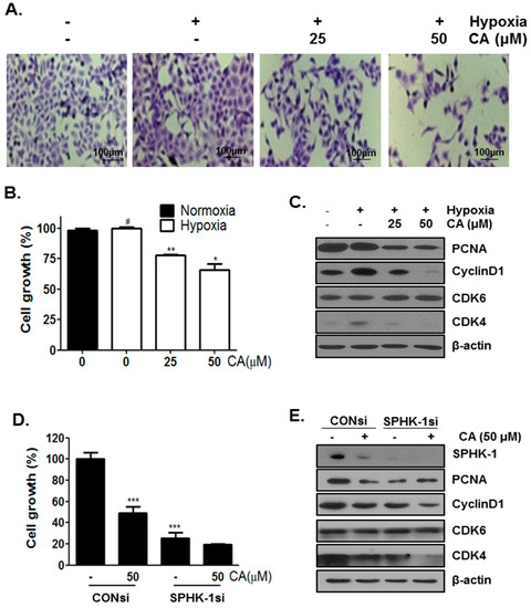 Inhibitory effect of CA on proliferation in DU145 cells under hypoxia for 3 days. (A) DU145 cells were treated without or with CA (25, and 50 µM) for 3 days under hypoxia and subjected to Crystal violet staining of cell growth. Scale bar = 100 μm ; (B) DU145 cells resolved in 70% ethanol after Crystal violet staining, and the optical density was read using a microplate reader at 570 nm. Data are presented as means ± S.D. (#) p < 0.05 compared to control under normoxia, (**) p < 0.01 and (*) p < 0.05 compared to control under hypoxia; (C) DU145 cells were treated without or with CA (25, and 50 µM) for 3 days under hypoxia and subjected to western blot analysis of protein levels (PCNA, CyclinD1, CDK6, CDK4, and β-actin); (D) DU145 cells were treated without or with CA (50 μM) for 3 days under hypoxia after SPHK-1 silencing for 24 h and subjected to Crystal violet staining of cell growth. DU145 cells resolved in 70% ethanol after washing with distilled water, and the OD was read using a microplate reader at 570 nm. Data are presented as means ± S.D. (***) p < 0.001 compared to control under hypoxia; (E) DU145 cells were treated without or with CA (50 µM) for 3 days under hypoxia after SPHK-1 silencing for 24 h and subjected to western blotting (SPHK-1, PCNA, CyclinD1, CDK6, CDK4, and β-actin).