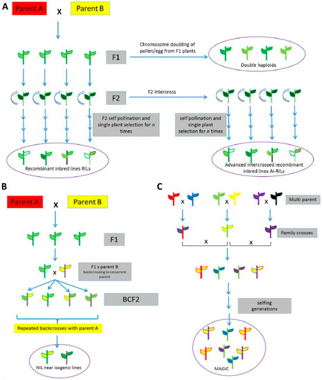 Population approaches commonly used in genetic studies. Marker-assisted backcrossing or gene pyramiding is the most successful method using genomics information, and are specially used in the introgression (Appendix A) of wild traits. For the identification of genomic regions/genes associated with a certain trait, three major mapping strategies are being used: QTL mapping (linkage mapping), association mapping (linkage disequilibrium mapping) and joint linkage-association mapping (Appendix A). Here are the main population approaches based on initial: bi-parental (A,B); or multi-parental (C) crosses for mapping. (A) F2: Individual F1 plants are self-pollinated to produce an F2 population; Doubled haploids (DH): genotypes formed when haploid cells (pollen/egg) are subjected to chromosome doubling. Recombinant inbred lines (RILs): a population generated from F2 individual plants that are repeatedly self-pollinated n times. Advanced intercrossed recombinant inbred lines (AI-RILs): a population generated by randomly and sequentially intercrossing the F2 lines followed by repeated self-pollinations n times; (B) Backcross inbred lines (BILs): repeated backcrossing (Appendix A) of F1 lines with one of its parents; Near isogenic lines (NILs): backcrossing of F1 with recurrent parent using lines that are identical except for differences in a few genetic loci; and (C) Multi-parent advanced generation inter-cross (MAGIC): a population produced by intercrossing families from multiple parents, followed by self-pollination n times.