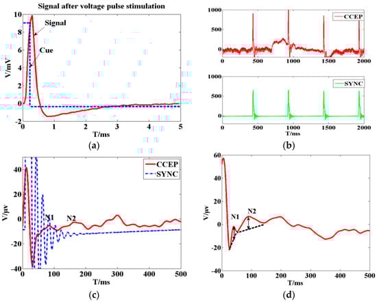 Three out of five experiments provided successful data (one failed experiment had strong noise and the other had low quality physiological signals). The results in Figure 1a show that epidural pulse voltage stimulus can be transferred effectively to cortical tissue. An obvious striking peak appears in the cortico-cortical evoked potential (CCEP) signal in the beginning (Figure 1b), which was defined as the electrical artifact of the stimuli because the striking peak’s width was consistent with the synchronous signal. The lock time property between the evoked response and the stimuli synchronized signal verified that the implantable wireless stimulation system led to an effective stimulation.