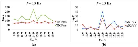 CCEPs change along with the varying stimulation intensity. The frequency is 0.5 Hz. Voc = 5 V. Vpc = 9.9–19.9V. The peak-peak amplitude and offset of square voltage pulse are 3.3 and 1.65 V. The pulse width is 0.5 ms. (a) The latency change of N1 and N2 (negative surface deflections) along with increasing Vpc. TN1 and TN2 represents the latency of N1 and N2; (b) The amplitude of N1 and N2 change along with the increasing Vpc. AN1 and AN2 represent the amplitude of N1 and N2, respectively.