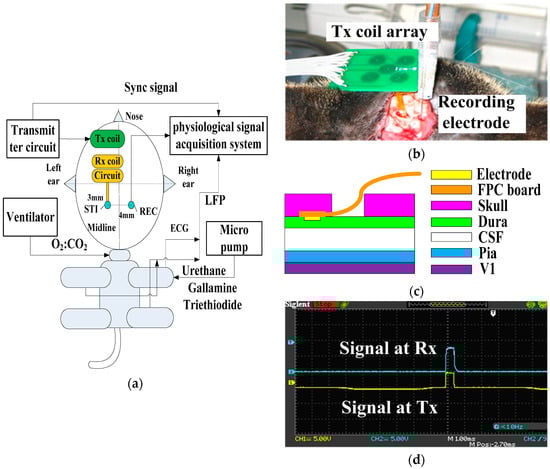 The receiving circuit was fixed on a shallow hole of the skull next to the stimulating electrode window. As shown in Figure 3e, an annular wall of 2 mm height was built on the surface of the receiving coil by sticking a plastic ring on the FPC coil by glue. The two leads of the implantable board were output voltage and ground. We fixed the receiving coil onto the transmitting coil’s array board in order to maintain the coupling distance. Figure 3f shows the two-channel implantable board with annular rings. Stainless steel needle electrodes in the scalp and in the nasal root acted as a reference and a ground. Each cat’s eyes were blinded using a black cloth in a quiet darkroom, as described in [].