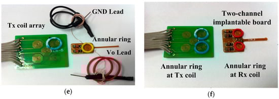 Two versions of the two-channel implantable interface were developed, with microcoil center distances (R0) of 10 and 15 mm, respectively (Figure 5c,d). Two versions were developed because the signal coupling coefficient in the target channel reached the maximum value when R0 was 15 mm, while the noise coupling coefficient in the target channel reached the minimal value when R0 was 10 mm. Both implantable interfaces needed an external microcoil array with the same R0 to inductively couple.