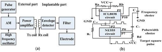The proposed implantable neural interface comprises of an external and implanted part. As seen in Figure 4a, the external part includes a signal generator, carrier oscillator, amplitude modulation (AM) circuit, and power amplifier circuit supplied by regulated direct-current (DC) power supplies. We developed the implant interface with the external part modified from a previously described setup []. The implanted part includes a microcoil, passive demodulated circuit, and surface electrodes (Figure 5a). We chose 1.8 and 2 MHz as carrier frequencies in consideration of human safety. The passive demodulated circuit included a double-diode peak envelope detector and low-pass filter for demodulating the low frequency stimulus signal. We designed a two-stage signal generator circuit in the transmitter module to replace the NE555 circuit used in the previous version []. As shown in Figure 4b, the first stage used an ICL8038 waveform generation, which was responsible for adjusting target frequency, and a NE555, which was responsible for target pulse width. This two-stage adjustment design can improve the adjustment of pulse width and frequency of the square pulse voltage at the transmitter side.
