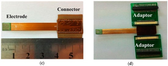 The electrode used in the original version was a six-layer FPC 72-electrode array in a 5 × 5 mm2 area for high electrode density (Figure 4c,d), but it had high stiffness due to its 0.33 mm thickness and large adaptor board, making this electrode not suitable for epidural stimulation. Therefore, we fabricated a softer surface electrode suitable for epidural stimulation with only 0.17 mm thickness (Table 2) using a four-layer FPC technique, with gold immersion of 100 nm to strengthen the electrode electrochemical performance.