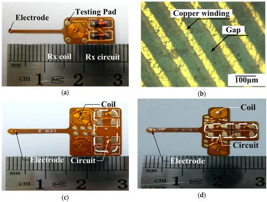 As shown in Figure 5a,b, we fabricated the receiving coil with octagonal spiral shape, L2, with 52 turns (4.2 mm in diameter) by four-layer FPC with 70 µm total thickness to couple with the external PCB microcoil L1 with 25 turns (8.4 mm diameter). Both line width and line spacing of the copper micro coil were 50 µm with 17.5 µm thickness (Figure 5b). The substrate layer and insulation layer, made of polyimide (PI) with 50 µm thickness, was biocompatible for acute animal experiment. The weld holes on the chip were for demodulated signal testing. The single channel receiver board interface with an area of 12 mm × 8 mm, except for the surface of the stimulating electrode, was insulated by a circuit insulation adhesive that was non-toxic, transparent, and made of acrylic acid and rubber. The integration of three parts including coil, demodulated circuit, and stimulating electrode makes the implantation into the epidural space more convenient than the previous design, which had separate electrodes and IPG. This new integration provides a more stable physical connection for stimuli delivery than the previous welded connection.