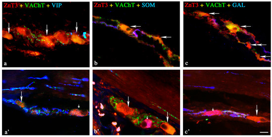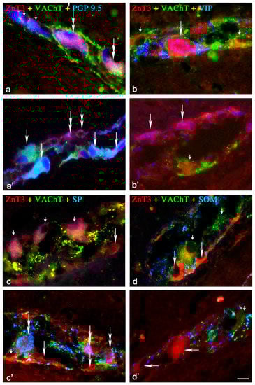 Representative images of ZnT3+ neurons located in the myenteric plexus (MP) of the porcine ileum: myenteric ganglia. All images are composites of merged images taken separately from blue, red and green fluorescent channels. Control (C) group: (a) ZnT3+/VAChT+/PGP9.5+ neurons are indicated with double-headed arrows, ZnT3−/VAChT−/PGP9.5+ neurons are indicated with small arrows; (b) ZnT3+/VAChT+/VIP+ neurons are indicated with an arrow, ZnT3+/VAChT+/VIP− neurons are indicated with small arrows; (c) ZnT3+/VAChT+/SP− neurons are indicated with small arrows; ZnT3+/VAChT−/SP− neurons are is indicated with arrows; (d) ZnT3+/VAChT+/SOM− neuron is indicated with a small arrow; ZnT3+/VAChT−/SOM− neurons are indicated with arrows. Inflammatory (I) group (a’) ZnT3+/VAChT+/PGP9.5+ neurons are indicated with arrows, ZnT3+/VAChT−/PGP9.5+ neurons are indicated with double-headed arrows; (b’) ZnT3+/VAChT−/VIP+ neurons are indicated with arrows; ZnT3+/VAChT−/VIP− neurons are indicated with a small arrow; (c’) ZnT3+/VAChT+/SP− neuron is indicated with a small arrow; ZnT3+/VAChT−/SP+ neurons are indicated with double-headed arrows; ZnT3+/VAChT−/SP− neurons are indicated with arrows; Control group (d’) ZnT3+/VAChT+/SOM− neuron is indicated with a small arrow; ZnT3+/VAChT−/SOM− neurons are indicated with arrows. Scale bar 25 µm.