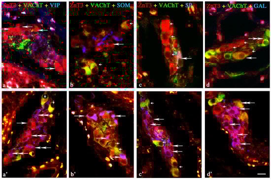Representative images of ZnT3+ neurons located in the inner submucous plexus (ISP) of porcine ileum. All images are composites of merged images taken separately from blue, red and green fluorescent channels. Control (C) group: (a) ZnT3+/VAChT−/VIP− neurons are indicated with arrows; I group (b) ZnT3+/VAChT+/SOM− neurons are indicated with small arrows; ZnT3+/VAChT−/SOM− neuron is indicated with an arrow; (c) ZnT3+/VAChT−/SP− neurons are indicated with small arrows; ZnT3+/VAChT+/SP+ neuron is indicated with an arrow; (d) ZnT3+/VAChT−/GAL− neurons are indicated with small arrows; ZnT3+/VAChT+/GAL− neuron is indicated with an arrow; ZnT3−/VAChT+/GAL− neuron is indicated with a double-headed arrow; Inflammatory (I) group: (a’) ZnT3+/VAChT+/VIP− neurons are indicated with small arrows; ZnT3+/VAChT−/VIP+ neurons are indicated with double-headed arrows; ZnT3+/VAChT−/VIP− neuron is indicated with an arrow; (b’) ZnT3+/VAChT−/SOM+ neurons are indicated with arrows; ZnT3+/VAChT+/SOM− neurons are indicated with small arrows; (c’) ZnT3+/VAChT−/SP+ neurons are indicated with arrows; ZnT3+/VAChT+/SP− neurons are indicated with small arrows; (d’) ZnT3+/VAChT+/GAL− neuron is indicated with a double-headed arrow; ZnT3+/VAChT−/GAL− neuron is indicated with a small arrow; ZnT3+/VAChT−/GAL+ neurons are indicated with arrows. Scale bar 25 µm.