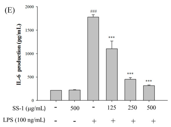 Macrophages were seeded at 5 × 104 cells/well in 96-well plates. Cells were incubated with SS-1 (125, 250 and 500 μg/mL) in the presence of LPS (100 ng/mL) for 24 h. Cell culture supernatants were centrifuged at 5000× g for 3 min at 4 °C to remove insoluble material. Secreted IL-1β, IL-10, IL-6, and TNF-α were measured in cell culture supernatants using commercially-available ELISA kits (BioLegend, San Diego, CA, USA) following the instructions provided by the manufacturers. The absorbance (450 nm) for each sample was analyzed using microplate reader and was interpolated with a standard curve. Results of three independent experiments were used for statistical analysis.