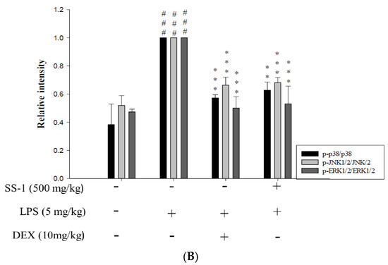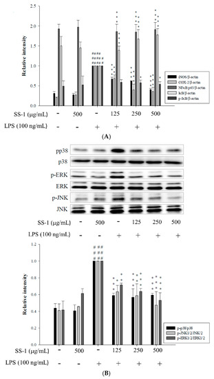 Effects of SS-1 on iNOS, COX-2, IκBα, p-IκBα, and NF-κB protein expression (A); and MAPK phosphorylation (B) in LPS-induced RAW264.7 cells. Cells were incubated with or without LPS (100 ng/mL) in the presence of various concentrations (125, 250 and 500 μg/mL) of SS-1 for 24 h. The data were presented as mean ± SD for the three different experiments performed in triplicate; ## p < 0.01, and ### p < 0.001 were compared with sample of control group (one-way ANOVA followed by Scheffe’s multiple range tests); * p < 0.05, ** p < 0.01 and *** p < 0.001 were compared with LPS-alone group.