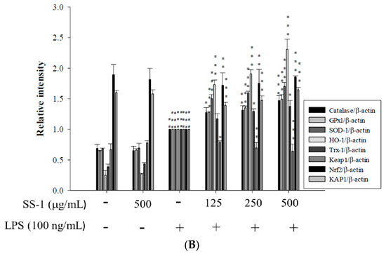 Effects of SS-1 on TLR4/PI3K/Akt/mTOR/IKK protein expression (A); and anti-oxidative enzymes, HO-1, Trx-1, and Nrf2/KAP1 protein expression (B) in LPS-induced RAW264.7 cells. Cells were incubated with or without LPS (100 ng/mL) in the presence of various concentrations (125, 250 and 500 μg/mL) of SS-1 for 24 h. The data were presented as mean ± SD for the three different experiments performed in triplicate; ## p < 0.01, and ### p < 0.001 were compared with sample of control group (one-way ANOVA followed by Scheffe’s multiple range tests); ** p < 0.01 and *** p < 0.001 were compared with LPS-alone group.
