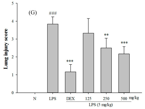 SS-1 attenuated pulmonary inflammation in vivo. Six hours after LPS injection with or without SS-1 pretreatments, mice were exsanguinated and their left lower lungs were fixed. Then, tissue sections were stained with hematoxylin and eosin (H&E): (A) Control; (B) LPS; (C) LPS + Dex; (D) LPS + SS-1-L; (E) LPS + SS-1-M; (F) LPS + SS-1-H. The figure demonstrates a representative view (×400) from each group; each bar represents the mean ± SD of six mice. (G) Severity of lung injury was analyzed by the lung injury scoring system. Each value represents as mean ± SD of six mice; ### compared with sample of control group; ** p < 0.01, and *** p < 0.001 were compared with LPS-alone group. The infiltrating neutrophils were more abundant in (B) LPS group as shown by arrows.