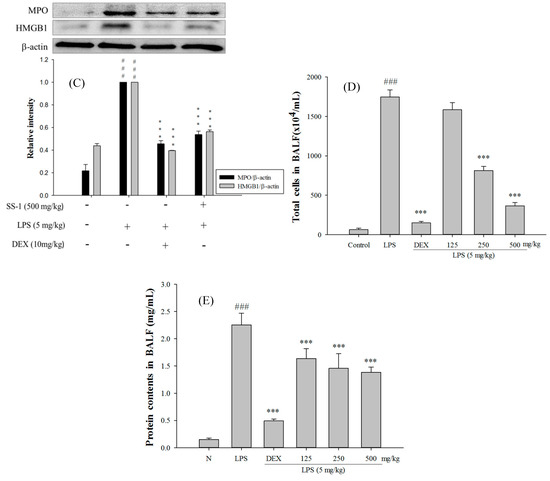 The SS-1-treated group exhibited significantly reduced wet/dry weight ratio of lung tissue, MPO activity, and total cell count and protein concentration in bronchoalveolar lavage fluid (BALF) than the LPS-induced group, as shown in Figure 5. Furthermore, in comparison with the LPS-induced group, the SS-1-treated group had a significantly lower HMGB1 protein expression level in the lung tissue.