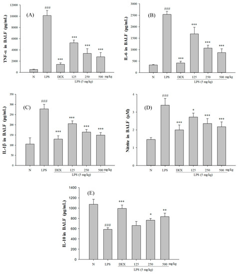 SS-1 down regulated: TNF-α (A); IL-6 (B); IL-1β (C); and NO (D); and increased IL-10 (E) in BALF. Six hours after LPS injection with or without SS pre-treatments, mice were sacrificed, their lungs were lavaged and the BALF were collected. TNF-α, IL-6, IL-1β, NO and IL-10 were detected by ELISA. Data represent mean ± SD of six mice; ### compared with sample of control group (one-way ANOVA followed by Scheffe’s multiple range tests); * p < 0.05 ** p < 0.01, and *** p < 0.001, were compared with LPS-alone group.