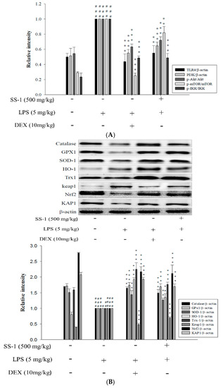 Effects of SS-1 on LPS-induced TLR4, PI3K, AKT, mTOR, and IKK protein expression (A); and antioxidative enzymes and HO-1, Trx-1, Nrf2/KAP1 protein expression (B) in lung in ALI mice. Mice were pretreated with different concentrations of SS for 1 h and stimulated with LPS. The Western blotting using specific antibodies was used for the detection of TLR4, PI3K, AKT, mTOR, and IKK protein expression. Data represent mean ± SD of six mice; # p < 0.05, ## p < 0.01, and ### p < 0.001 were compared with sample of control group (one-way ANOVA followed by Scheffe’s multiple range tests); ** p < 0.01, and *** p < 0.001, were compared with LPS-alone group.