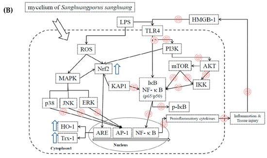 Finally, our experimental results showed that mycelium of S. sanghuang exhibits good anti-inflammatory properties. Both in vitro and in vivo assays showed that SS-1 can regulate the expression levels of TLR4/PI3K/Akt/mTOR and IKK proteins, inhibit the activation and nuclear translocation of NF-κB, and reduce the phosphorylation of proteins related to the MAPK pathway, thereby reducing the release of pro-inflammatory cytokines and inflammatory substances from cells, improving inflammatory response. In addition, SS-1 could also up-regulate the expression of antioxidant enzymes and HO-1, Trx-1 proteins, inhibit cell inflammation, and remove ROS at large scale by regulating KAP-1/Nrf2 protein expression. The mycelium of S. sanghuang has potential in the treatment and/or prevention of inflammatory-related diseases, such as ALI.