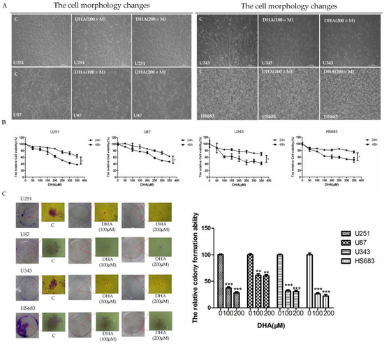 Dihydroartemisinin (DHA), which is one of the main active metabolites of arteminisin (Qinghaosu), is used as anti-malarial agents [4,5]. Previous studies have reported that DHA has strong anticancer activities through inhibiting the proliferation and invasion of different types of cancers such as gastric cancer [6], hepatocellular carcinoma [7], breast cancer [8], ovarian cancer [9], and lung cancer in vitro [10] and in vivo [11]. In glioma cells, DHA has also been shown to inhibit proliferation, metastasis, and invasion, and enhance radio sensitivity, but these molecular mechanisms need to be further investigated [12,13,14].