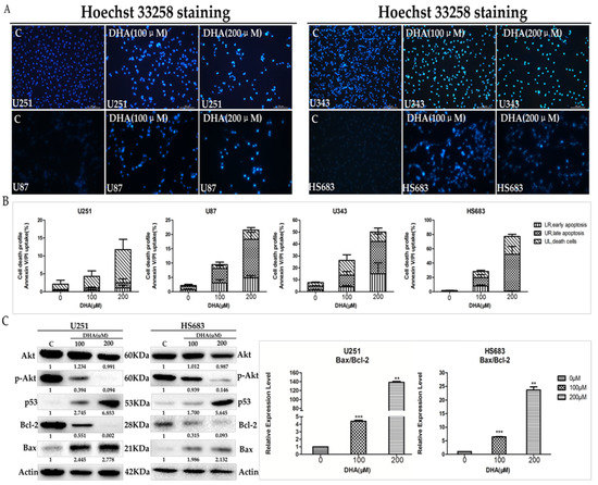 To further investigate the effect of DHA on the apoptosis of malignant glioma cells, Hoechst 33258 staining and Annexin V/Propidium Iodide (AnnexinV/PI) flow-cytometry assay were applied to measure cell apoptosis after 48 h of treatment with DHA. Hoechst 33258 staining showed that DHA caused condensed and/or fragmented nuclei in malignant glioma cells (Figure 2A). Figure 2B showed that DHA increased apoptosis of malignant glioma cells in a dose-dependent manner. When the concentration of DHA reached 200 μM, the apoptosis rate was significantly higher than that of untreated cells. According to previous studies, various signaling pathways have been reported to account for DHA-induced apoptosis in different cancer cells. Of these proposed mechanisms, the ability of DHA to affect the AKT axis was especially noteworthy [31,32,33], so we investigated its role in DHA inducing malignant glioma cell apoptosis in this study. Western blot analysis showed that DHA inhibited AKT phosphorylation, activated p53, and increased the ratio of Bax/Bcl-2 in a dose-dependent manner (Figure 2C). Taken together, these results suggested that AKT/p53/Bcl-2/Bax axis played a pivotal role in DHA-induced malignant glioma cells apoptosis.