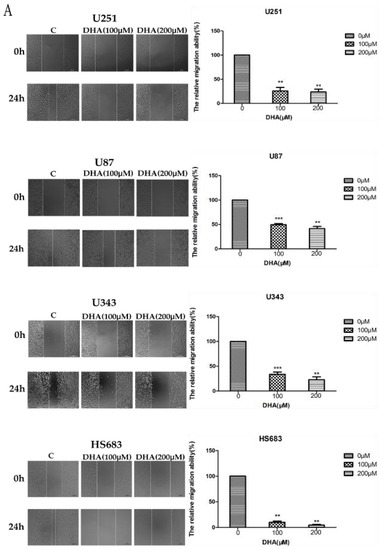 Malignant glioma cells (U87, U251, U343, and HS683) were cultured in six-well plates. After cells approached almost 100% confluence, the supernatant was absorbed and the cells were scraped with the fine end of 20 µL pipette tips. Then the cells were washed with PBS to remove detached cells and medium was added with series doses of DHA. Cell metastasis was photographed by microscope at 0 and 24 h, respectively. Remodeling was measured as diminishing distance across the induced injury, normalized to the 0 h control, and expressed as outgrowth. The migratory properties of glioma cells did not vary after treatment with the solvent (only) used to dissolve DHA.