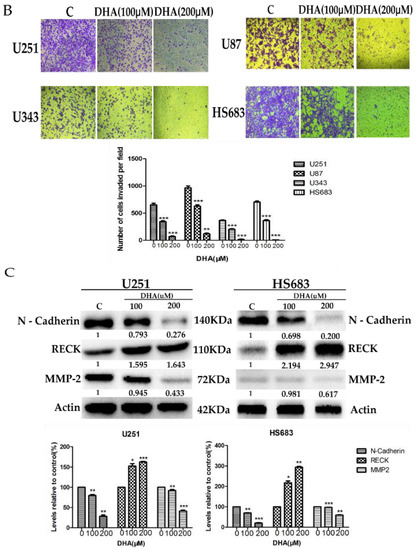 Inhibitive effect of DHA on the metastasis and invasion of malignant glioma cells by upregulating RECK (reversion-inducing-cysteine-rich protein with kazal motifs). (A) The inhibitive effects of DHA on malignant glioma cells migratory ability. Values were mean ± SD (n = 3), ** p < 0.01, *** p < 0.001 as compared with negative control cells; (B) the effects of DHA on malignant glioma cells invasion ability. Values were mean ± SD (n = 3), ** p < 0.01, *** p < 0.001 as compared with negative control cells; (C) the changes of proteins associated with metastasis and invasion induced by DHA. Malignant glioma cells were treated with DHA for 24 h, then the protein levels of RECK, MMP-2, and N-Cadherin were assessed by western blot analysis. Values were mean ± SD (n = 3), * p < 0.05, ** p < 0.01, *** p < 0.001 as compared with negative control cells.