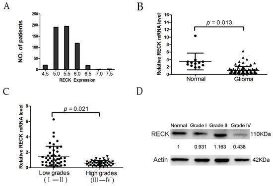 We further investigated the expressional profile of RECK in glioblastoma multiforme (GBM) tumor tissues. As shown in Figure 5A, the Cancer Genome Atlas (TCGA) data of RECK mRNA levels in 548 GBM tumor tissues assessed by Affymetrix U133A arrays revealed that RECK mRNA levels ranged from 4.06 to 7.25 with more than 95% samples below median expression level 6.0, so the expression of RECK mRNA in the majority of the GBM tumor tissues was low. Furthermore, we validated the RECK mRNA expression by real-time quantitative reverse transcription-PCR (qPCR), and our results showed that the RECK mRNA level was significantly lower in malignant gliomas compared to lower grade gliomas and non-tumor brain tissues (Figure 5B,C). Moreover, western blot analysis showed the RECK protein level was similar with regards to its mRNA in malignant gliomas, lower grade gliomas, and non-tumor brain tissues (Figure 5D).