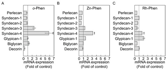Effects of o-Phen, Zn-Phen, and Rh-Phen on proteoglycan expression in vascular endothelial cells. Bovine aortic endothelial cells were treated with o-Phen (A); Zn-Phen (B); or Rh-Phen (C) at 5 µM each at 37 °C for 24 h and proteoglycan mRNA levels were analyzed by real-time RT-PCR. Values are means ± S.E.M. of four samples. ** p < 0.01 vs. the corresponding control.