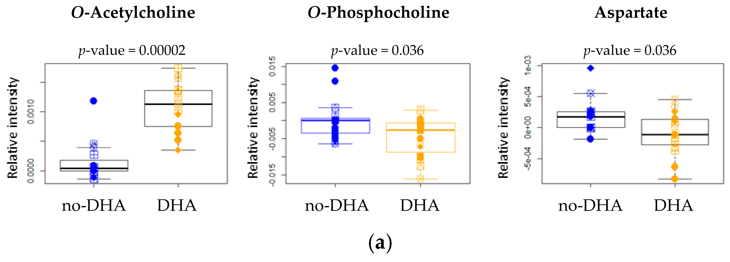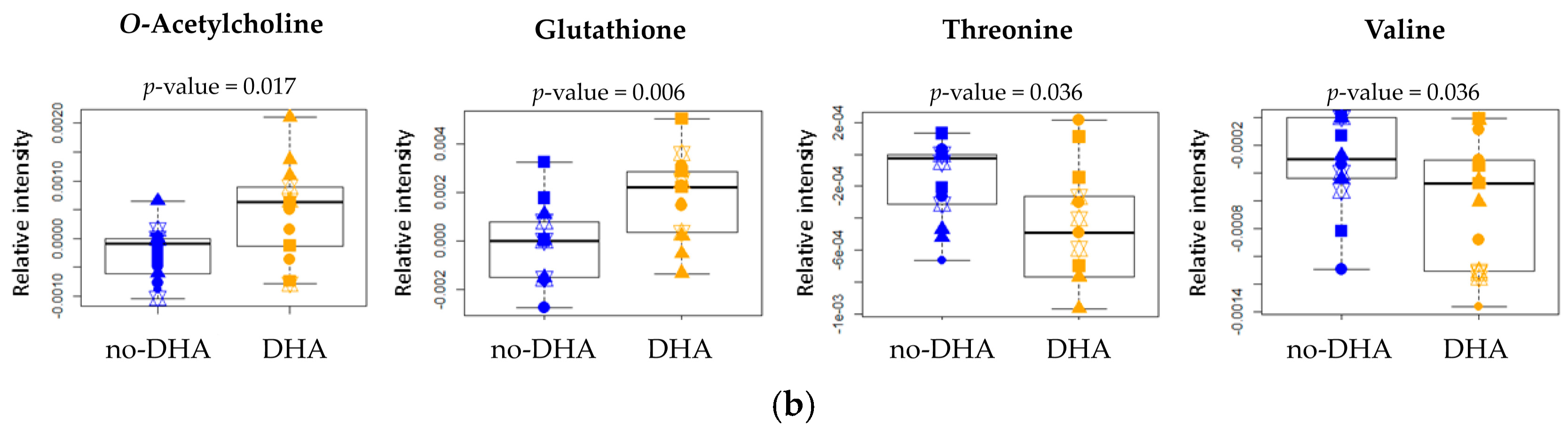 | Metabolites (ppm) | “DHA” vs. “No-DHA” | “PRO” vs. “No-PRO” | “PCA” vs. “No-PCA” | |||||||||