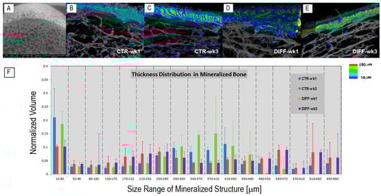 Table 1 data), is often not complete, requiring a more effective study of the mineralized bone size distribution. For this reason, to investigate more deeply the changes over time of the newly formed bone, the “mineralized bone thickness distribution vs. the bone volume normalized to the total sample volume” was also assessed in the trabecular portion of the samples. The histograms of the mineralized bone thickness distribution in all the investigated samples were reported in