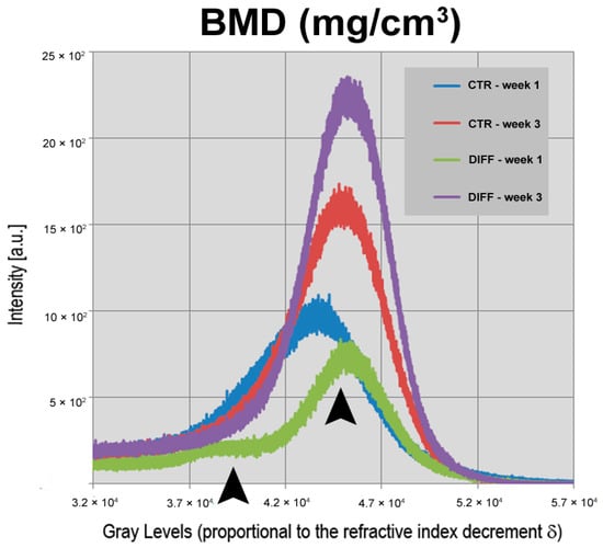 p > 0.05) were present in terms of BMD between CTR and DIFF cultures at identical time points, with two mineralization levels after the first week of culture (first level: mean grey value
