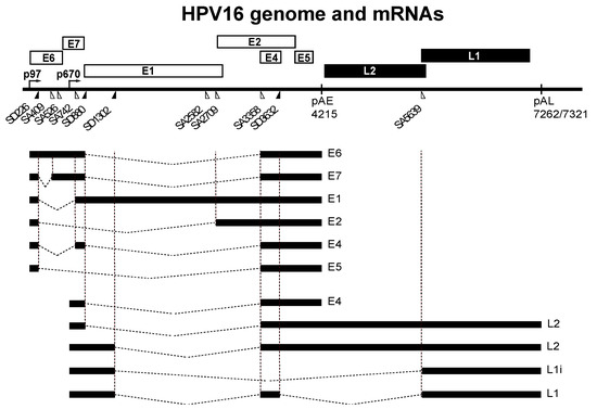 Schematic drawing of the human papillomavirus type 16 (HPV16) genome [3]. Boxes indicate open reading frames, filled triangles represent 5′-splice sites and open triangles represent 3′-splice sites. The early promoter p97 and the late promoter p670 are indicated, early and late polyadenylation signals pAE and pAL are indicated. A selection of alternatively spliced HPV16 mRNAs are shown below the HPV16 genome. L1 and L1i represent two alternatively spliced L1 mRNAs.