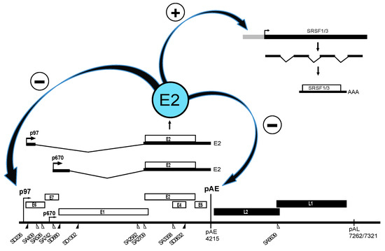 - Klymenko, T.; Hernandez-Lopez, H.; MacDonald, A.I.; Bodily, J.M.; Graham, S.V. Human papillomavirus E2 regulates SRSF3 (SRp20) to promote capsid protein expression in infected differentiated keratinocytes. J. Virol. 2016, 90, 5047–5058. [Google Scholar] [CrossRef] [PubMed]