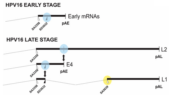 The middle region of the HPV16 genome contains splice sites and a polyadenylation signal (pAE) that are subject to regulation. At an early stage of the HPV16 life cycle, the HPV16 3′-splice site SA3358 connects with the early polyadenylation signal pAE to produce all early mRNAs except E1 and E2 mRNAs, thus producing E6, E7, E4 and E5 mRNAs (Figure 1). As the HPV16-infected cell differentiates and the early promoter p97 is shut down and the late promoter p670 is induced, the usage of SA3358 appears to increase, and is now utilized for production of E4, L2 and L1 mRNAs (Figure 3). HPV16 3′-splice site SA3358 is therefore used during both early and late stages of the HPV16 viral life cycle. The HPV16 E4 protein is therefore part of both the early and the late HPV16 gene expression programs. During the early stage, SA3358 efficiently connects with the early polyadenylation signal pAE to produce mRNAs that end at pAE (Figure 3). This efficient connection prevents read-through into the late region and inhibits utilisation of the exclusively late HPV16 5′-splice site SD3632 that is located in between SA3358 and pAE (Figure 3). Measures to prevent HPV16 late gene expression at an early stage of the HPV16 life cycle include active suppression of SD3632 as well as positive stimulation of pAE by multiple elements located upstream and downstream of pAE. The HPV16 3′-splice site SA3358 is therefore a key player in the switch from HPV16 early to late switch by its association with either the early polyadenylation signal at the early stage of the infection, and late splice site SD3632 and both pAE and pAL at the late stage of the infection (Figure 3).