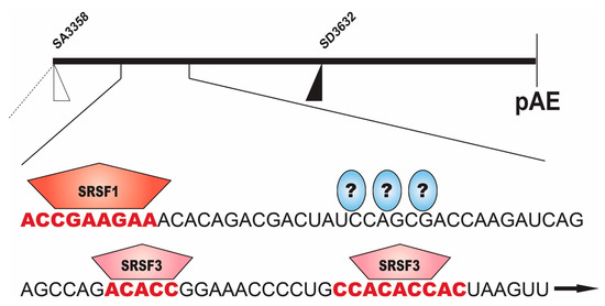 Schematic drawing of the middle region of the HPV16 genome ranging from the HPV16 3′-splice site SA3358 to the early polyadenylation signal pAE. The suppressed HPV16 late 5′-splice site SD3632 is indicated [41]. The blow up shows the splicing enhancer that is required for splicing to SA3358 [34,35,36]. Binding sites for the splicing factors serine/argine rich splicing factors 1 and 3 (SRSF1 and SRSF3) are indicated in red [6,7,9,35,36,37]. Question marks indicate unidentified cellular proteins that bind to the splicing enhancer.